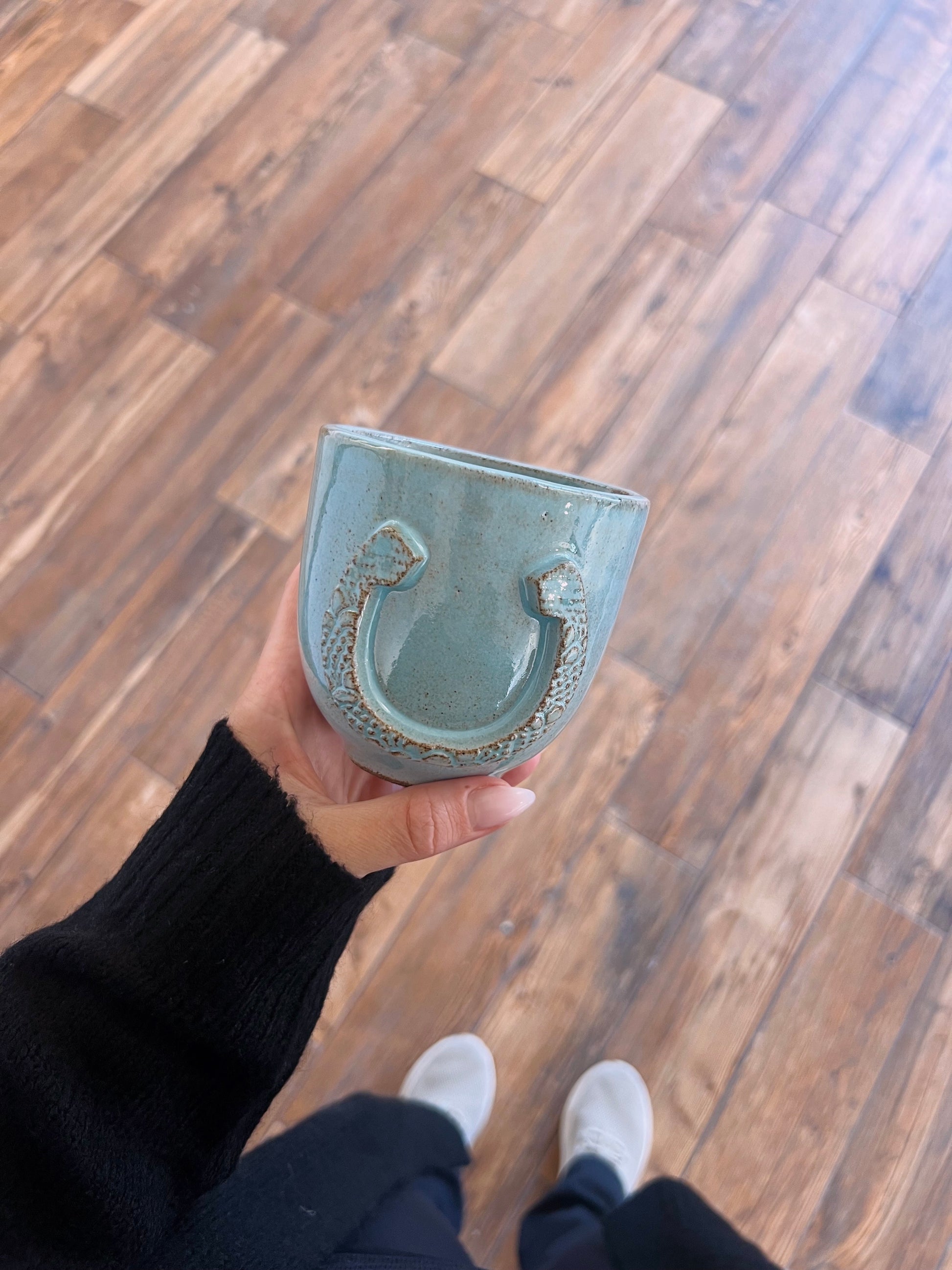 Handgjord keramikmugg i stengods, ca 10 cm i diameter, ca 10 cm hög. Tål diskmaskin.